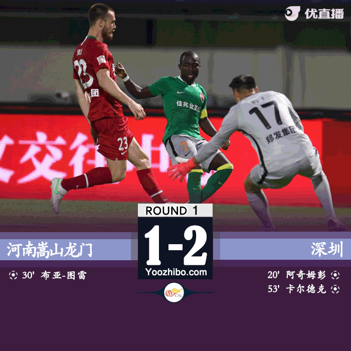 24直播网4月21日讯 北京时间4月21晚8点,2021赛季中超联赛广州赛区首轮比赛继续展开角逐,深圳队与河南嵩山龙门在花都体育场直接交锋。上半场,金特罗助攻阿奇姆彭率先建功,随后,张鹭出击失误被图雷打空门得手。下半场,卡尔德克利用角球头槌为深圳再次超出比分。最终,深圳队2-1战胜河南嵩山龙门,取得联赛开门红。