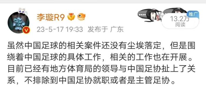在张家胜上任了总局副局长后,名记李璇也是回应:虽然中国足球相关案件还没有尘埃落定,但是围绕着中国足球的具体工作,相关的工作也在开展,目前以前有地方体育局领导和中国足协扯上了关系,不排除到中国足协任职或者是主管足协。