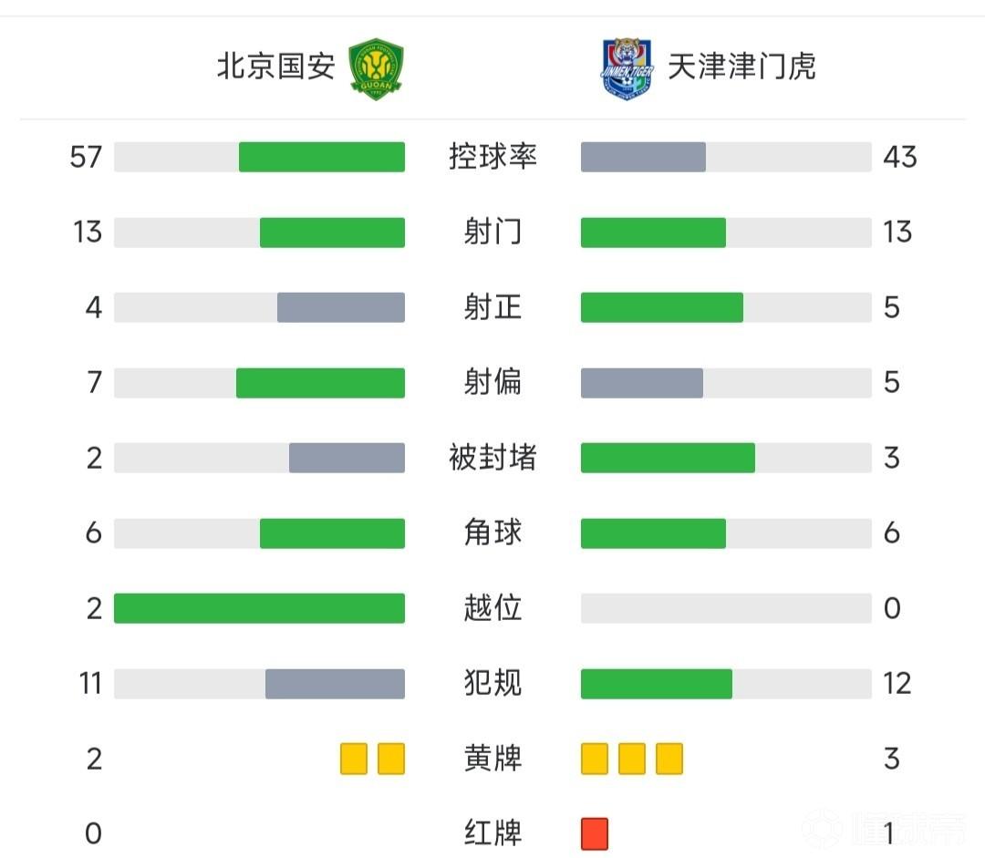 第80分钟,王刚右侧肋部传中,王子铭跟进头球扳平比分,北京国安1-1天津津门虎。