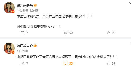 知名足球记者徐江在社交媒体上表示:“中超目前能不能正常开赛是个大问题了,因为能拍板的人全进去了!中国足球裁判界,苦苦捍卫中国足球最后的尊严!留给他们的比赛时间不多了!”