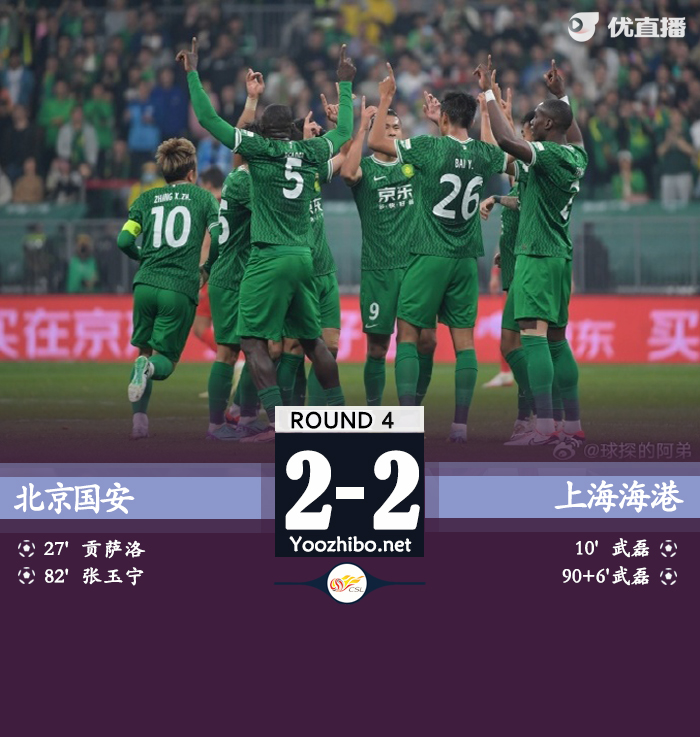 海港2-2国安 武磊梅开二度+绝平,张玉宁点射