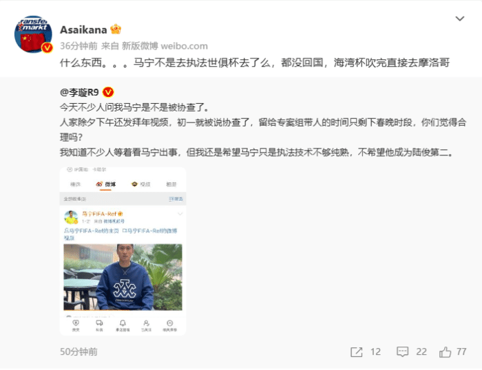 来源:24直播网01-23 18:0824直播网01月23日讯 近日,有媒体爆料中国裁判马宁被抓,随后德转朱艺和足球报主任李璇发文进行了辟谣。