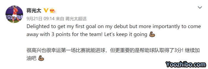 作为中国男足最少争议的一名归化球员,蒋光太中途离开广州队之后在代表上海海港首秀获得手球。剪光头在社交账号上用英文表达了自己的喜悦,还在附上中文的翻译:“继续加油,很高兴也很幸运第一场比赛就能进球,但更重要的是帮助球队取得了3分”。众所周知,蒋光太是在英伦的华裔球员,经过埃弗顿的足球青训培养之后,进入了职业联赛以及英格兰的国字号球队。