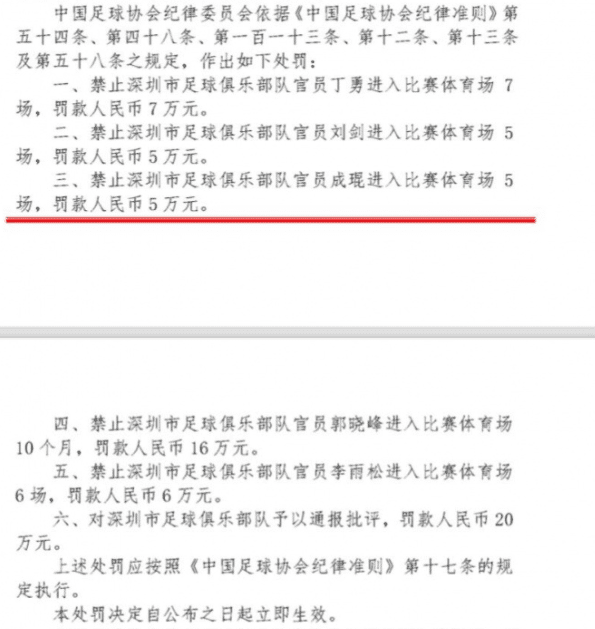 来源:24直播网06-28 21:0624直播网06月28日讯 ,中超深圳VS成都蓉城比赛引发争议的主裁判张雷及边裁将参加听证会,同时还有深圳方面被认定违规的4-5人,包括总经理和队医。现在足协的处罚结果已经出炉,5名深足俱乐部人员被禁赛罚款,其中最严厉的是被红牌罚下的队医郭晓峰,他被禁止进入比赛体育场10个月,罚款16万元。深足俱乐部通报批评,罚款20万元。这样,足协的罚单中,对深圳队5名官员共罚款39万+俱乐部罚款20万,累计罚款59万元。