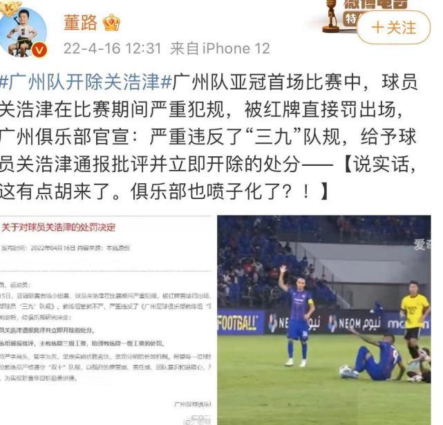 在广州队开除球员后,两大国内知名媒体人董路和马德兴,也第一时间发声。作为最近一段时间国内足坛最有流量的话题王。董路这次也认为广州队的处罚欠妥,他用了“有点胡来了”5个字,点评恒大此举,并且还质疑道:“难道俱乐部也喷子化了?”