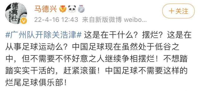 至于一直与广州队俱乐部关系不佳的马德兴,则言辞激烈地愤怒开喷“这是在干什么?摆烂?这是在从事足球运动么?中国足球现在虽然处于低谷之中,但不需要不怀好意之人继续争相摆烂!不想踏踏实实干活的,赶紧滚蛋!中国足球不需要这样的烂尾足球俱乐部! ”。尽管他没有提到广州队任何一个字,但所有人都知道他骂的是哪支俱乐部。
