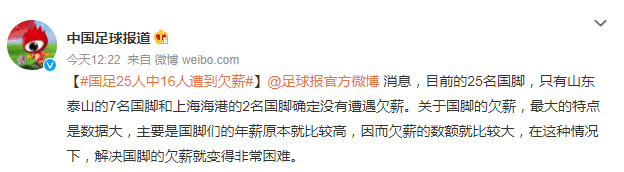 国足25人中,只有泰山7人和海港2人未遭欠薪