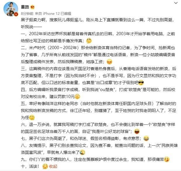 董路回应稿件错别字:22年前不会打字,我只是口述!再讽巩汉林+喷子