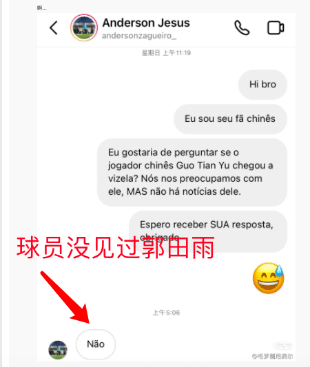 是的,制造出留洋机会,就是为了让他们提升,可是这个球迷再和葡萄牙联赛维泽拉队后卫安德鲁聊天中询问有没有见过留洋他们球队的男足前锋郭田雨,可是让人意想不到的是,宣称留洋2个多月的郭田雨,竟然没有队友见过他。