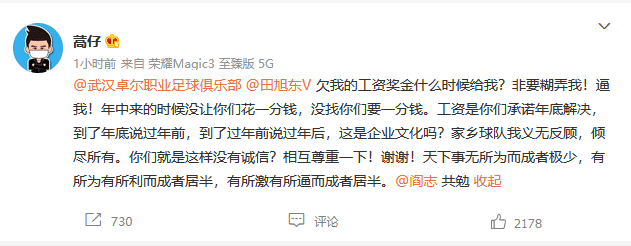 蒿俊闵在微博公开发表了声明,表示:“欠我的工资奖金什么时候给我?非要糊弄我!逼我!年中来的时候没让你们花一分钱,没找你们要一分钱。工资是你们承诺年底解决,到了年底说过年前,到了过年前说过年后,这是企业文化吗?家乡球队我义无反顾,倾尽所有。你们就这样没有诚信?相互尊重一下!谢谢!天下事无所为而成者极少,有所为有所利而成者居半,有所激有所逼而成者居半。”最后一句出自曾国藩的家书。
