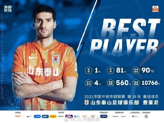 在泰山队的夺冠战役中,费莱尼打入1球,帮助泰山队提前三轮夺得本赛季中超联赛冠军,71.1%的得票率足以看出费莱尼被球迷的认可度。