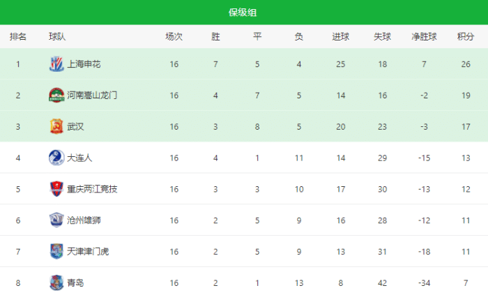 保级组1-4名:上海申花、河南嵩山龙门、武汉队、大连人;