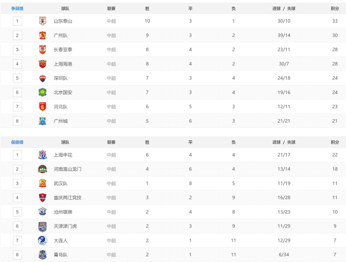 先看下中超第一阶段结束后,争冠组和保级组的积分情况。争冠组泰山队33分领跑,广州队30分紧随其后,亚泰和海港都是28分,四支球队的积分差距并不是很大。深圳队和国安都是24分,河北队23分,广州城21分,四队要想争冠,难度还是非常大,毕竟他们落后榜首有至少3场球的距离。