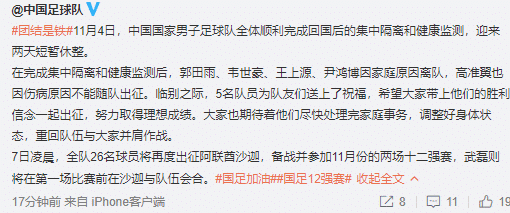 据悉国足全队将会在7日凌晨出征西亚,去到沙迦参加比赛,到时候国足的大名单也将会正式确定。而武磊已经确定会在第一场比赛对阵阿曼队之前与全队会合,备战接下来的12强赛。