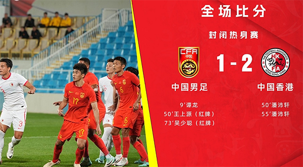 来源:24直播网01-02 11:1324直播网01月02日讯 国足在亚洲杯之前最后一场热身赛,以1-2不敌中国香港,时隔38年再度不敌对手。这场比赛是封闭进行的,没有直播,本场王上源和吴少聪先后染红,关注度助教也被红牌驱逐,最终国足在通过谭龙先进一球的情况下,被中国香港逆转,对手进球的是潘沛轩,他上演梅开二度的好戏,逆转击败国足。