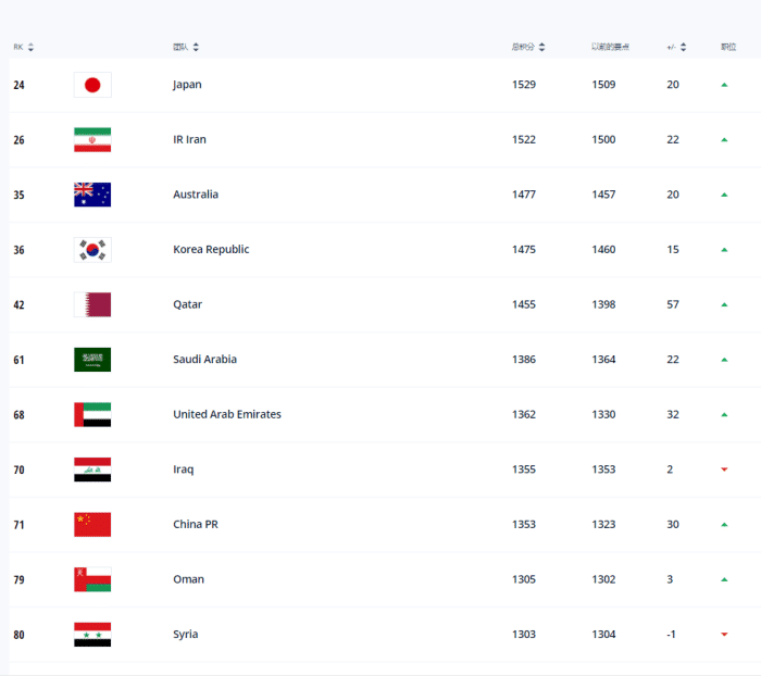 而亚洲球队方面,日本国家队排名第一,他们的世界排名是24,伊朗排名第二,他们的世界排名是26,澳大利亚排名第三,他们的世界排名是第35,韩国队排名第四,世界排名第36,卡塔尔亚洲第五,世界第42,沙特亚洲第六,世界第61,阿联酋第七,世界第68,伊拉克是第八,世界第70,国足排名亚洲第九,世界排名第71名,不过国足的进步还是很大的,此前国足排名世界第77,现在上升了7名。