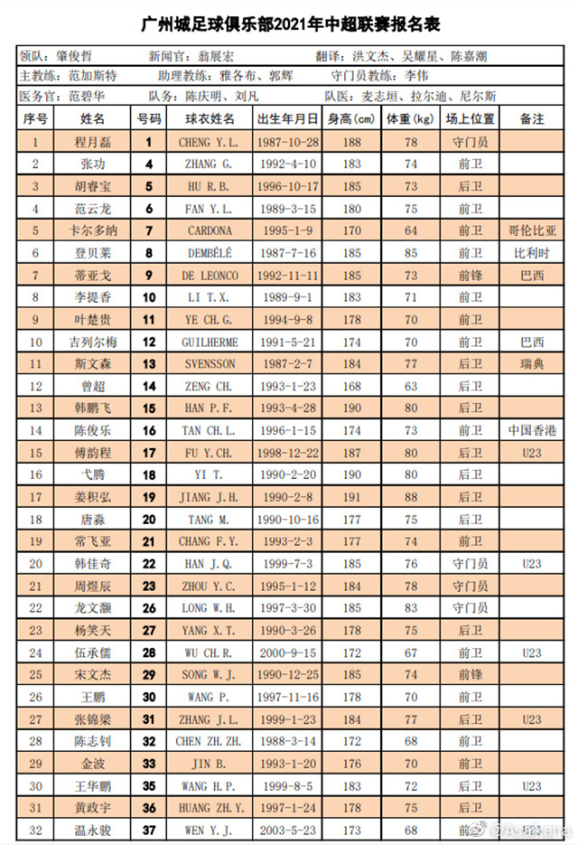 前锋:J-卡多纳、迭戈-德里昂科、曾超、宋文杰、陈志钊、温永骏、