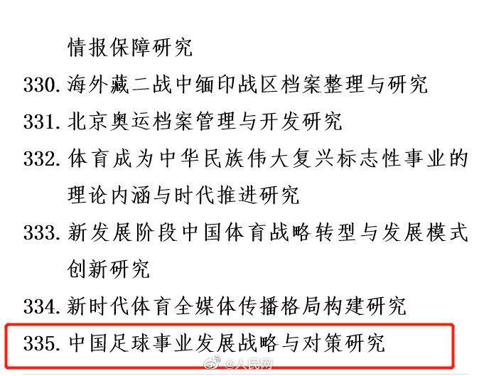 我们发现,在招标选题研究方向中,中国足球事业发展战略与对策研究列入其中。