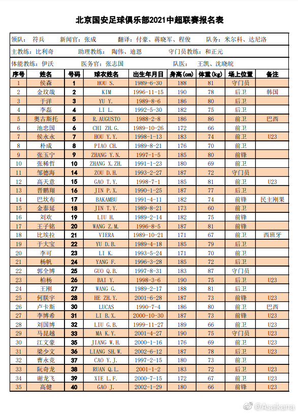 | 40 | 高健 | 185 | 74 | 前锋 | 中国 | - | - |
