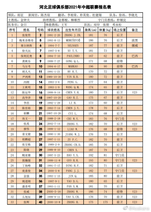 前锋:徐天沅、高华泽、廖伟、张呈栋、张威、么旭辰、马尔考
