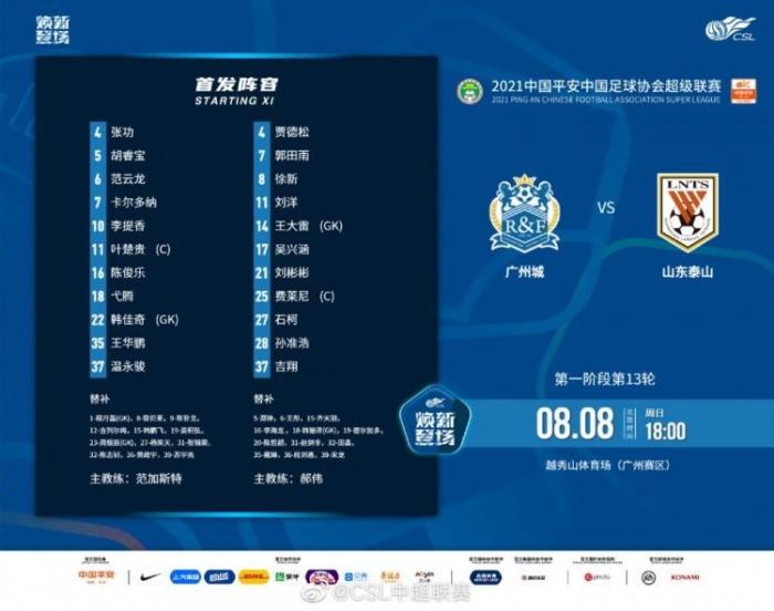 山东泰山首发:14-王大雷、4-贾德松、11-刘洋、27-石柯、17-吴兴涵、21-刘彬彬、25-费莱尼、8-徐新、28-孙准浩、37-吉翔、7-郭田雨(U23)