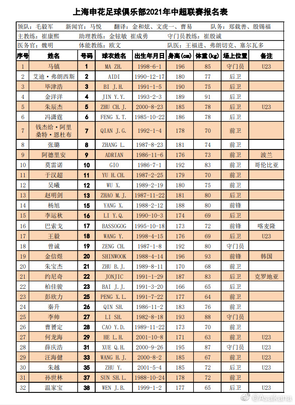 | 号码 | 姓名 | 身高 | 体重 | 位置 | 国籍 | 预计身价 |