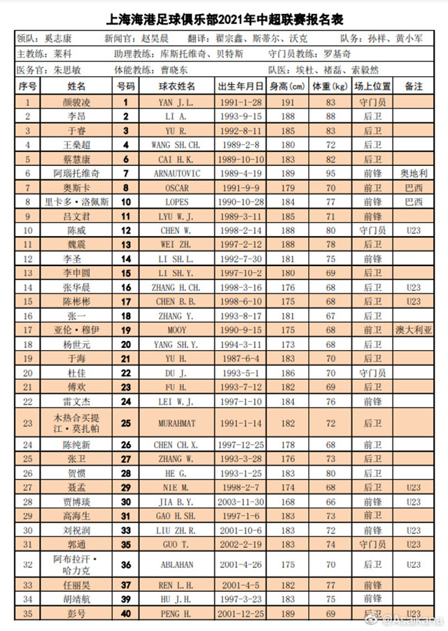 2021-22赛季中超上海海港球员名单一览