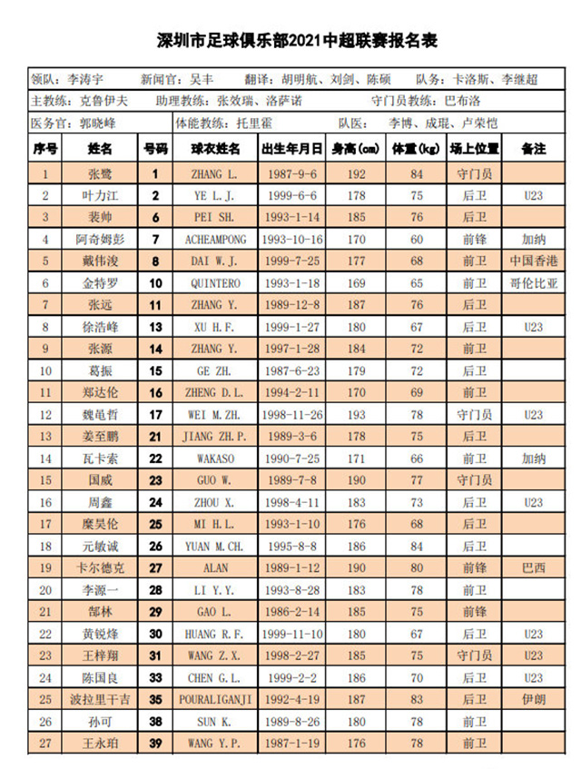 2021-22赛季中超深圳队球员名单一览