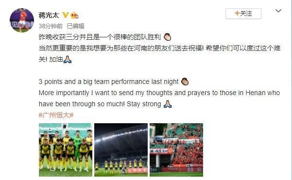 24直播网讯 昨晚,中超第7轮,广州队6-0战胜了青岛队。比赛结束后,广州队球员蒋光太发微博为正在遭遇洪灾的河南人民送去了祝福。