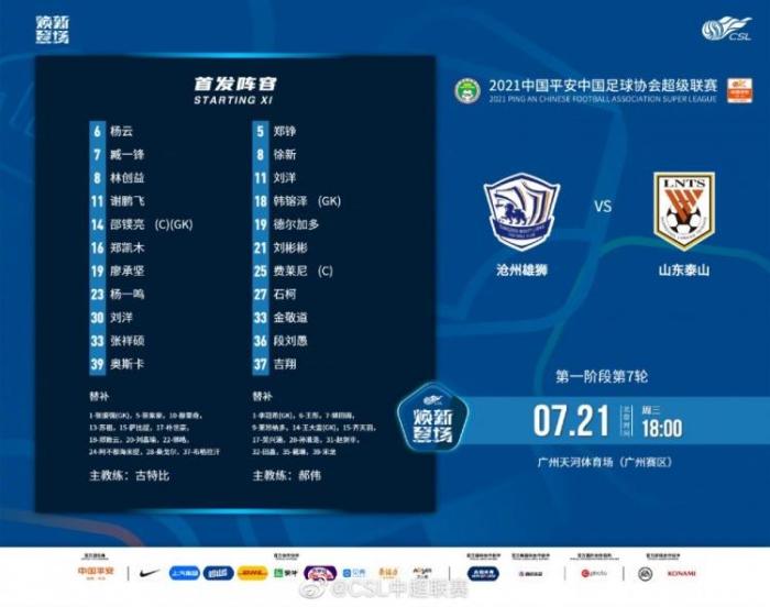 沧州雄狮vs山东泰山首发:德尔加多出战