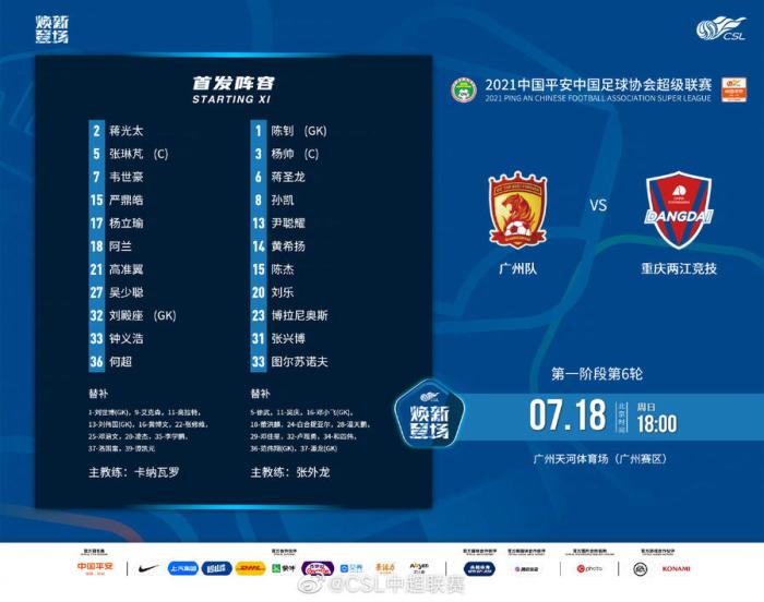 广州队vs重庆两江竞技首发:阿兰、韦世豪出战