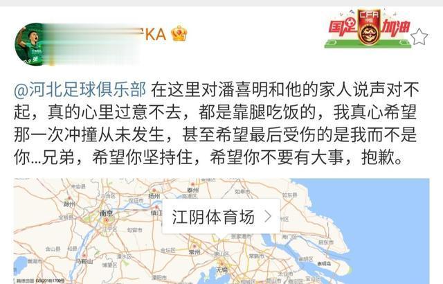 张玉宁在微博写道:@河北足球俱乐部 在这里对潘喜明和他的家人说声对不起,真的心里过意不去,都是靠腿吃饭的,我真心希望那一次冲撞从未发生,甚至希望最后受伤的是我而不是你…兄弟,希望你坚持住,希望你不要有大事,抱歉。