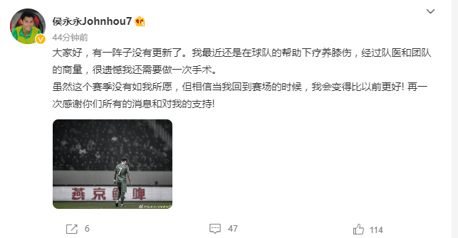 24直播网讯侯永永写道:大家好,有一阵子没有更新了。我最近还是在球队的帮助下疗养膝伤,经过队医和团队的商量,很遗憾我还需要做一次手术。