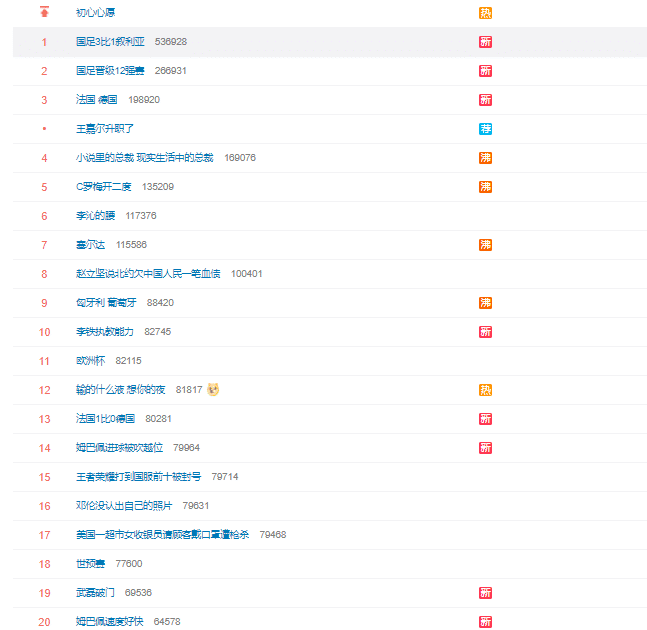 到了赛后,网络上的热搜榜,也是国足的关键词热议度比德法大战更好,武磊的搜索人数要比姆巴佩等人高,可见在我们国内,国足是绝对的顶流,连欧洲杯的焦点战都无法比拟。当然要论精彩程度肯定是德法大战,这场比赛是两支世界杯冠军球队的碰撞,最终胡梅尔斯的乌龙球让德国队遗憾落败,两队均处于死亡之组,所以接下来的比赛都不能够大意。