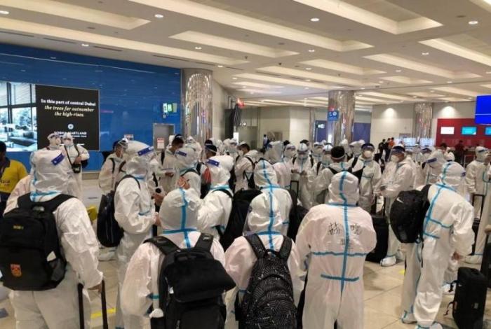出于防控需要,国足将士们在抵达迪拜之后全部穿上了防护服,并戴上护目镜和手套,“全副武装”办理过关手续。