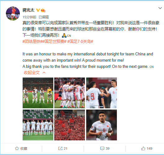 蒋光太在微博写道“真的很荣幸可以完成国家队首秀并带走一场重要胜利!对我来说这是一件很自豪的事情!特别要感谢远道而来的球迷和那些坐在屏幕前的你,谢谢你们的支持!下一场我们再接再厉!