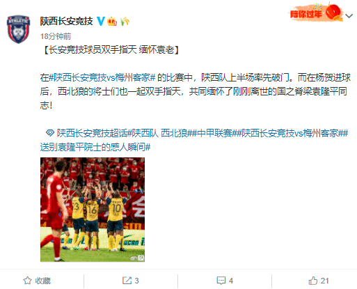 24直播网讯 北京时间5月24日,在陕西长安竞技对阵梅州客家#的比赛中,陕西队球员共同缅怀了袁隆平同志。