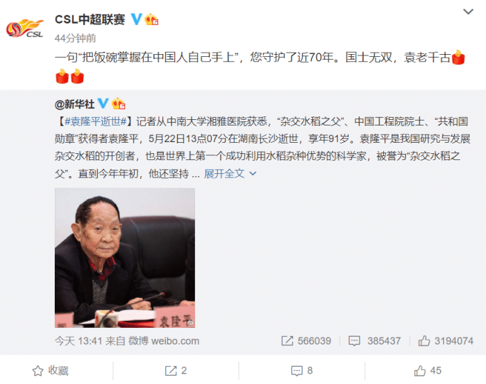 24直播网讯今日,中超联赛官博发文悼念袁隆平。
