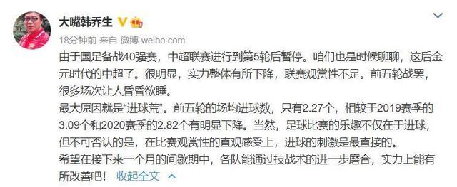 24直播网讯 北京时间5月19日,评述员韩乔生在个人社交媒体上发表了他对本赛季中超联赛的看法。