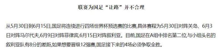半岛都市报:中超联赛为国足让路的可能性不大