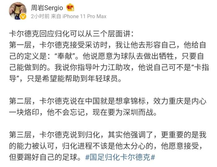 第三层,卡尔德克说到归化,其实他强调了,更重要的是我的能力被认可,归化进程不该是他太分心的,他愿意接受,但要踢好自己的足球。”