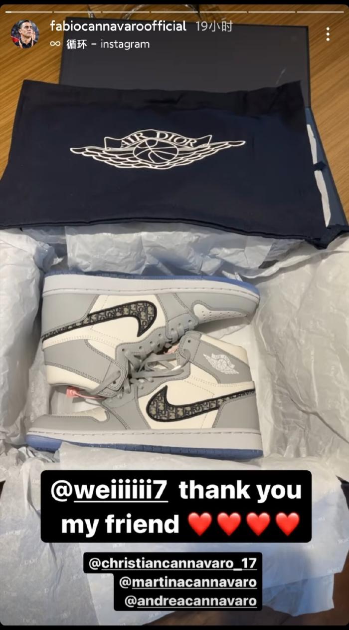 而就在近日,韦世豪为了团结主教练,让他脚踏实地在广州队好好执教,特意送了一双乔丹与迪奥联名35周年限量款AJ1。据悉,这双鞋在国内可以炒到45000元至76000元人民币。 值得一提的就是,这双鞋也深得卡纳瓦罗的欢心,还在社交账号上对韦世豪表达了感谢。