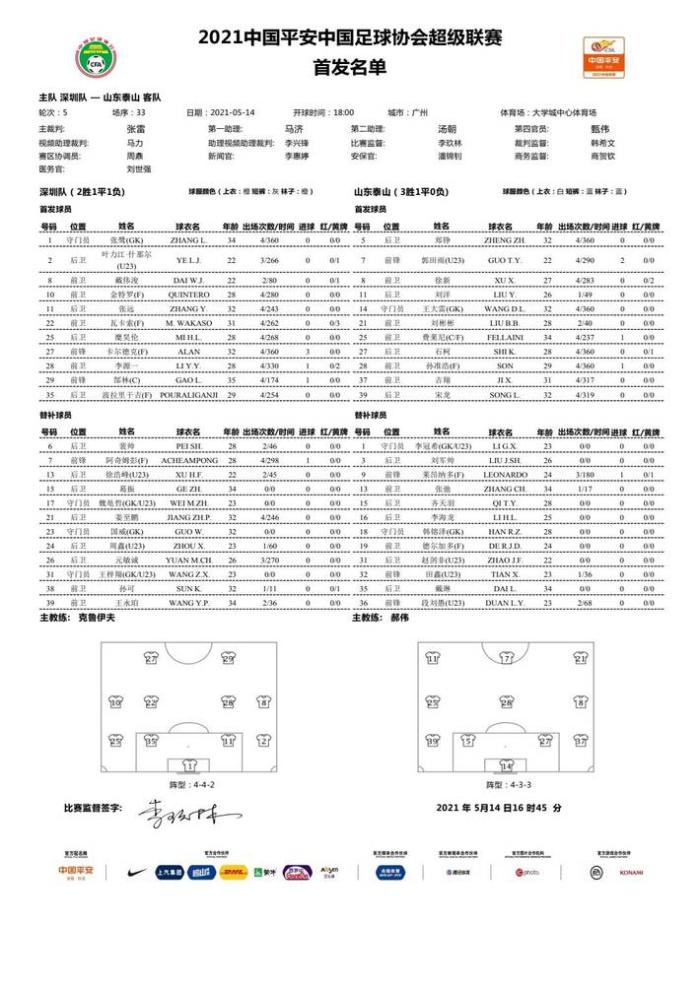 来源:24直播网05-14 19:5624直播网讯北京时间5月14日18:00,中超第五轮,深圳将迎战山东泰山。赛前,双方公布了本场比赛的名单。