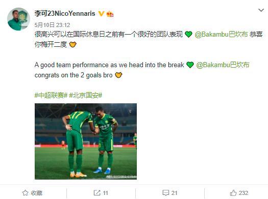 24直播网讯 北京时间昨晚,凭借巴坎布的梅开二度,北京国安2-0战胜武汉,迎来两连胜。赛后,李可更新个人社交媒体为本巴坎布送上祝贺。