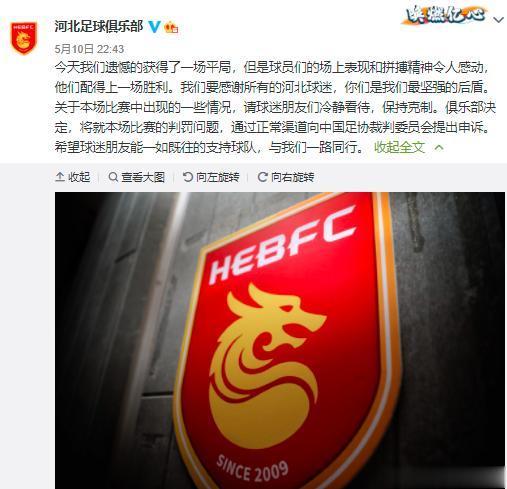 河北官方:就本场比赛,将向足协裁判委员会申诉