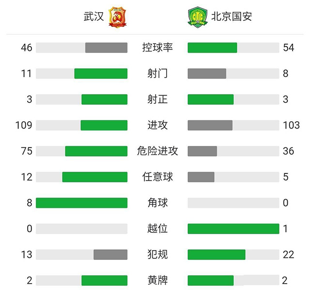 下半场易边再战,武汉首先进行换人,李兴齐替下方昊。刚开场不到1分钟,武汉后场出现失误,国安打出反击,张玉宁一脚打门被卡里索封堵,巴坎布顺势一脚抽射将球打进,北京国安2-0武汉。