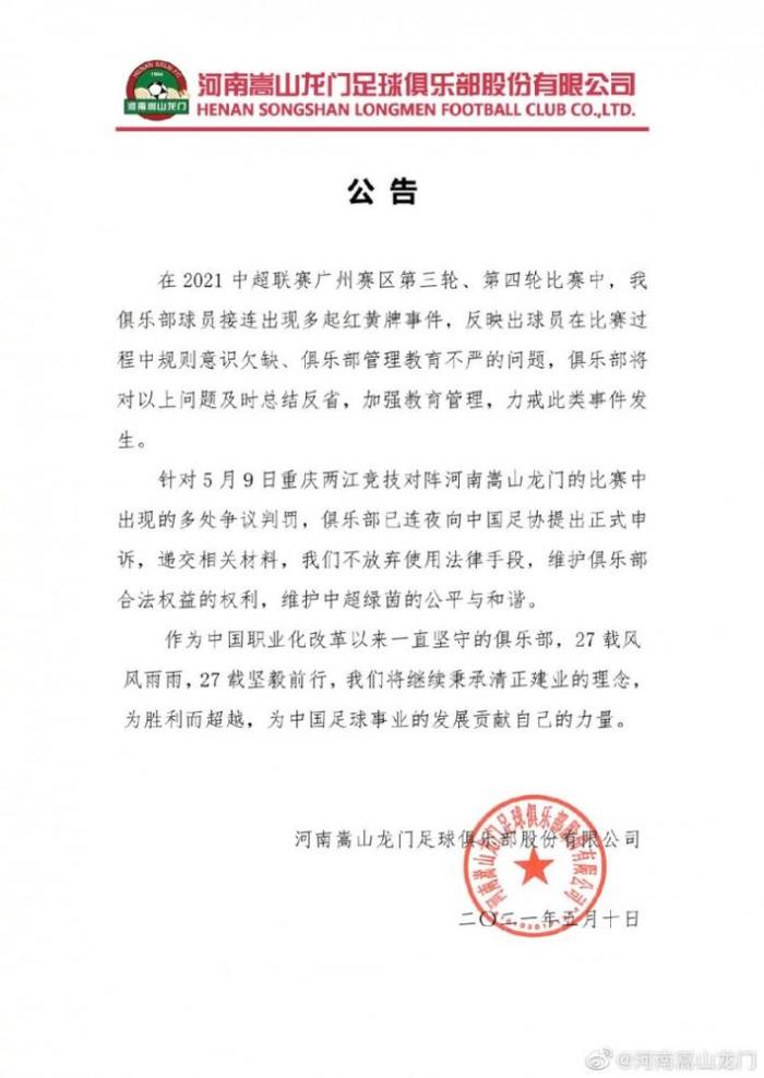 来源:24直播网05-10 16:2724直播网讯 今天,河南嵩山龙门俱乐部发布公告,就昨晚与重庆两江竞技比赛中的争议判罚向足协提出申诉。