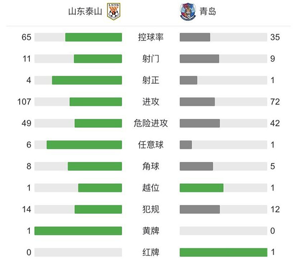 全场比赛结束,最终泰山队2-0击败青岛队。