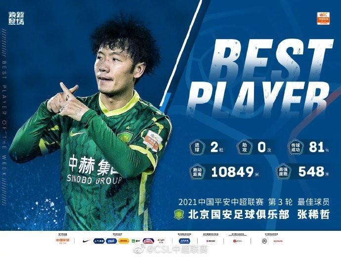 24直播网讯 今天,中超联赛官方公布了第三轮最佳球员评选结果,国安球员张稀哲以77.5%的得票率当选。