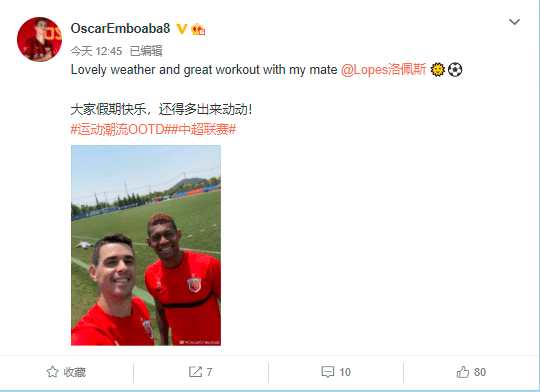奥斯卡配文道:“天气不错,和我的队友洛佩斯一起训练,大家假期愉快,还得多出来动动!”